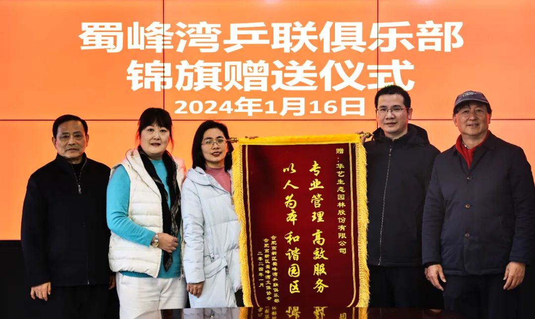 1月16日,合肥高新區(qū)蜀峰灣乒聯(lián)俱樂部、合肥高新區(qū)蜀峰灣文體協(xié)會向華藝生態(tài)園林股份有限公司贈送一面“專業(yè)管理 高效服務(wù) 以人為本 和諧園區(qū)”錦旗。以表示對華藝園林在蜀峰灣體育公園匠心匠藝的營造建設(shè)、智慧化管養(yǎng)以及精細(xì)化的服務(wù),為廣大市民提供了一個人與自然和諧共生的美麗美好環(huán)境的高度贊揚和誠摯感謝。